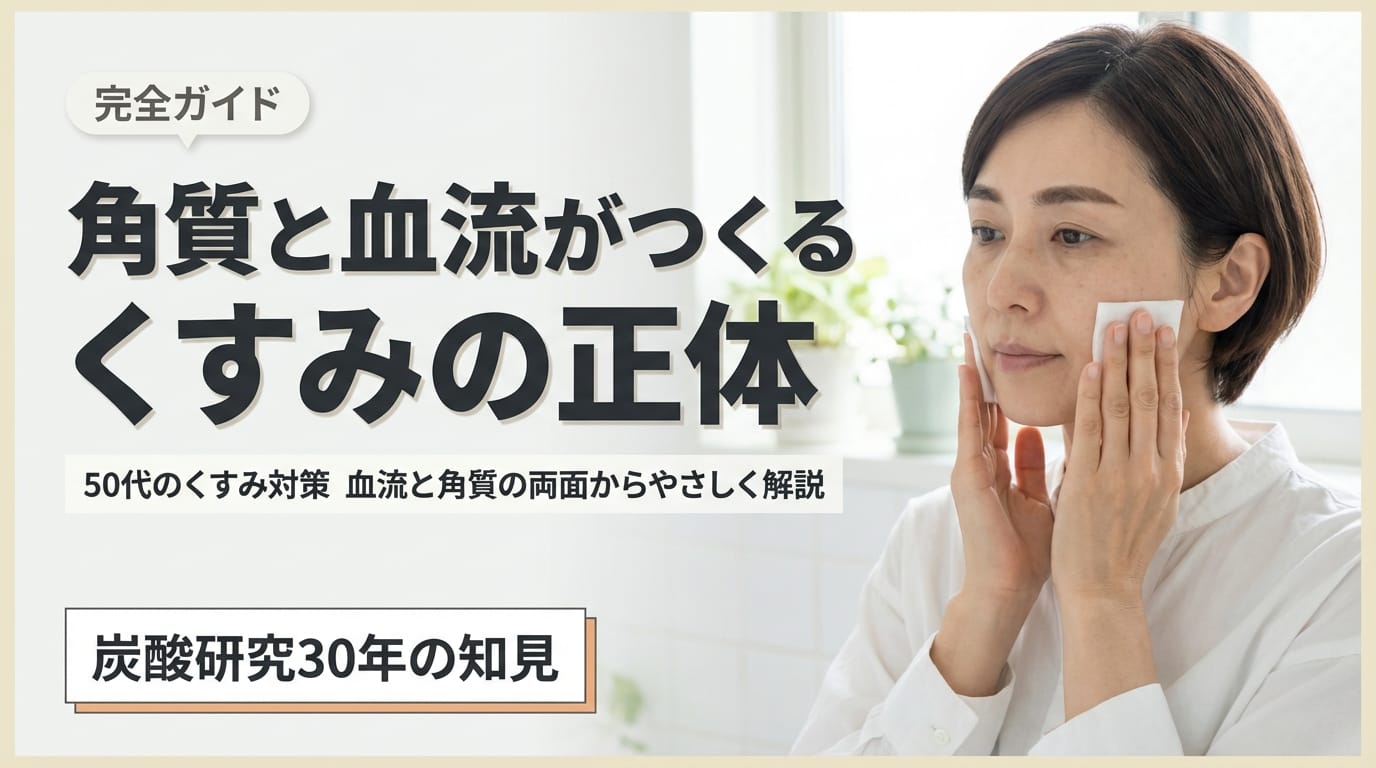 「くすみって何が原因なの?」「年齢のせいで仕方ないの?」——そう感じている方にこそ読んでいただきたい内容です。本記事では、1997年頃から約30年にわたり炭酸コスメの研究開発を続けてきた化粧品製造メーカーの視点から、くすみの原因を「角質」と「血流」の両面で紐解いていきます。